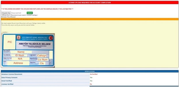 7- Ekranın alt tarafında amatör telsizcilik belgesi yükleme bölümünden belgenizin fotoğrafını yükleyiniz.