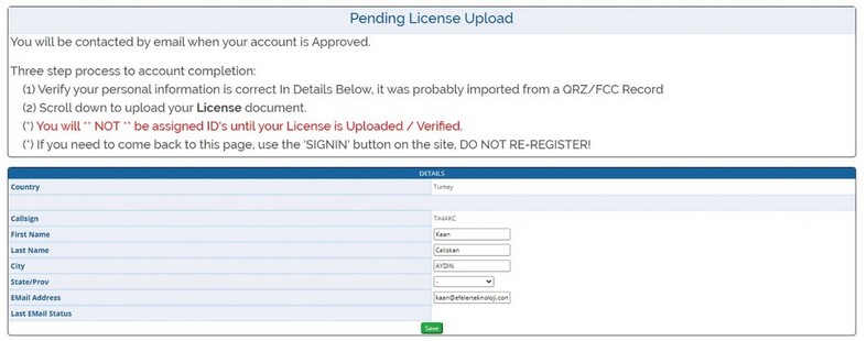 8- Belgeniz doğrulandıktan sonra bir kaç gün içinde yeni DMR ID'niz oluşmuş olacaktır.